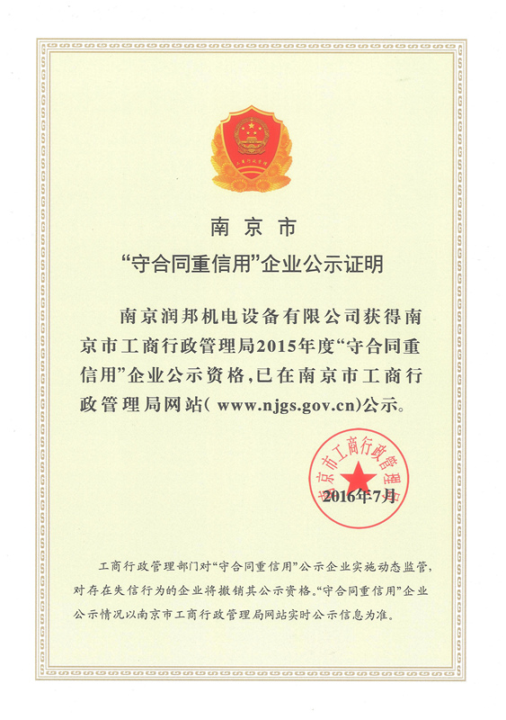近日,接到南京市企業(yè)信用管理協(xié)會(huì)通知,我公司正式通過2015年度市級(jí)“守合同重信用”企業(yè)的認(rèn)定,并予授牌和頒發(fā)證書。